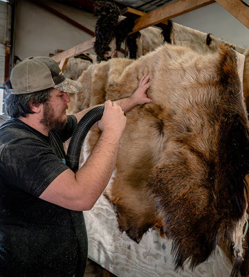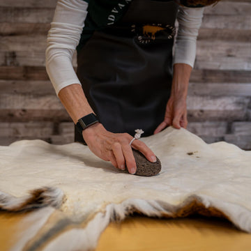 This is where craftsmanship shows. The hide is stretched, softened, and finished by hand — worked repeatedly until it’s flexible, smooth, and ready for display or use. A final buff brings out the natural sheen and grain, revealing the result of patience, skill, and attention to detail.