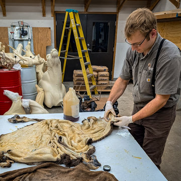 Every great tan starts here. This is where the hide is cleaned, prepped, and stabilized — the foundation for a professional-grade finish. Using the Tan-A-Hide Kit, excess tissue is carefully removed, the skin is salted to draw out moisture and preserve integrity, then rehydrated for even penetration during the tanning process.