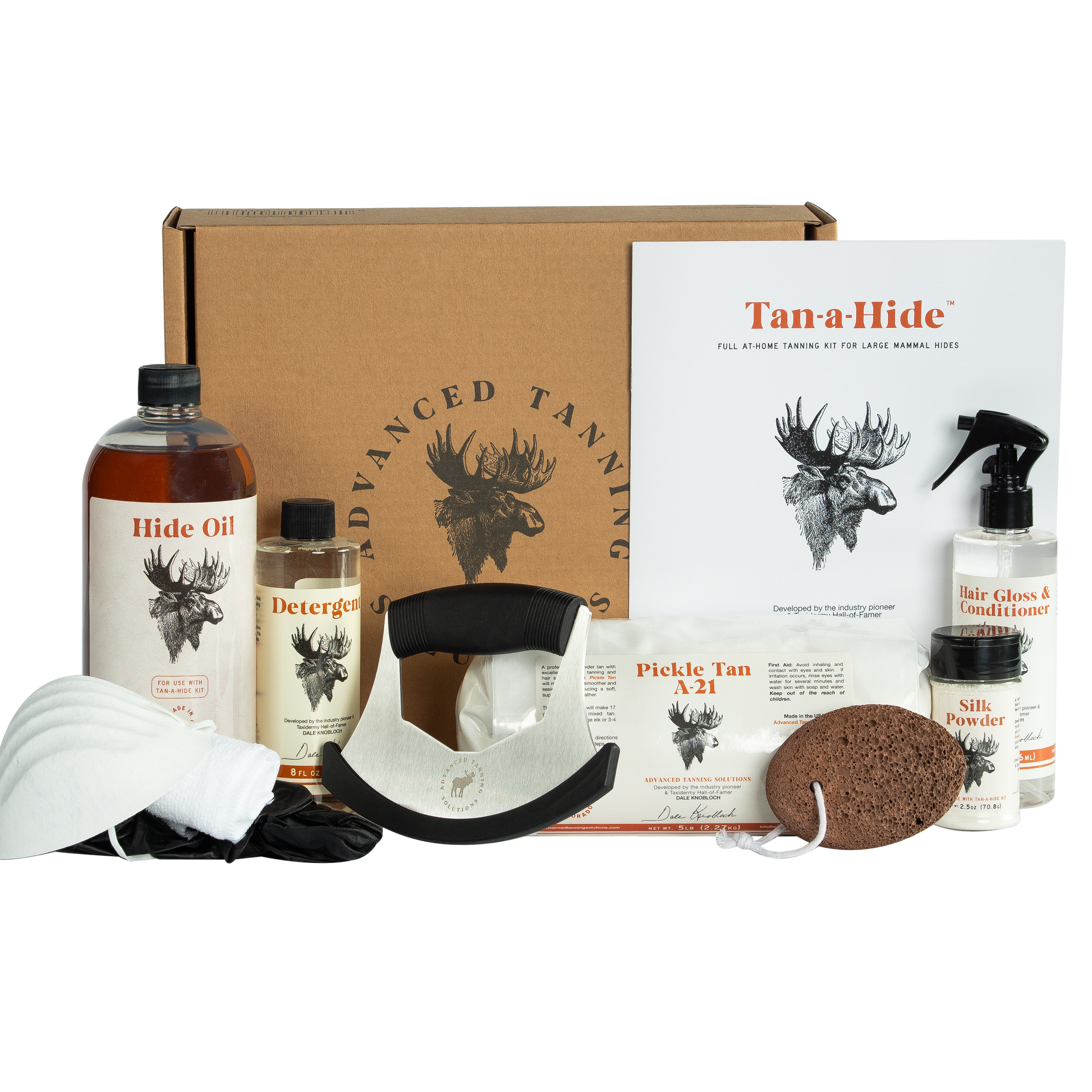 Tan-a-Hide is an all-inclusive deluxe tanning kit specifically designed for tanning large mammals such as deer, antelope, elk, moose and other like animals. It contains a full set of Dale’s newly formulated products to produce a high quality hide with special finishing tips and touches. The kit will tan approximately 3-4 medium size deer or up to a life-size elk, moose or cow.