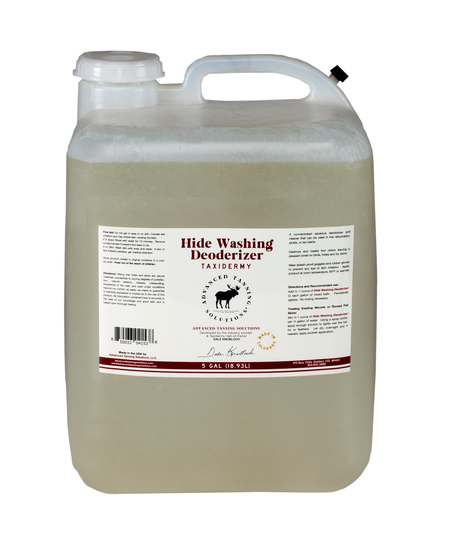 A concentrated aqueous deodorizer/cleaner that can be used in the pickle, tan or rehydration bath. Kills and masks foul odors. Leaves a pleasant smell on the hide and skin.